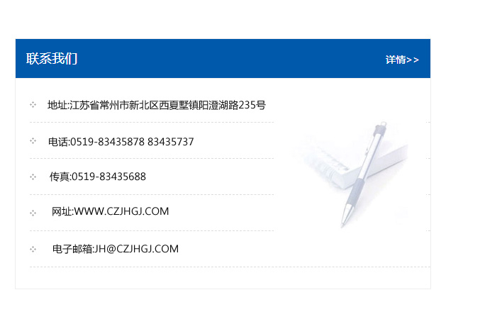 地址:常州市新北區友邦商務大廈1幢16、17層  電話:0519-85101652  傳真:0519-85112595  郵編:213022  網址:www.cz-jiayue_cn.cnyyjjw.com  郵箱:xiajifengaa@163.com